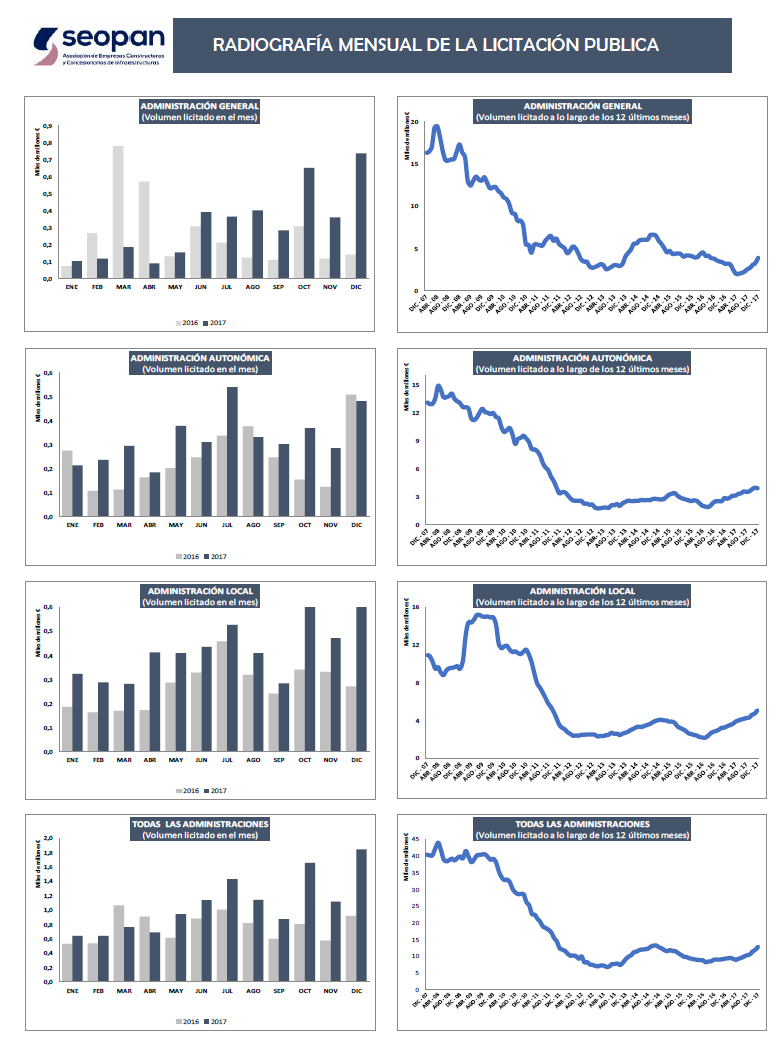 La licitación de las administraciones locales que supuso el 39,6 por ciento del total, creció un 56,3 por ciento, la de la administración central supuso el 30 por ciento del total licitado y creció un 22,3 por ciento, y la autonómica que representó el 30,4 por ciento de lo licitado por todas las administraciones, avanzó un 37,6 por ciento.