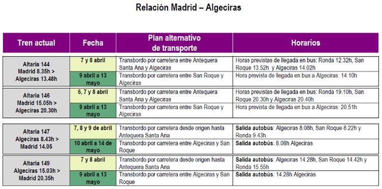 En los trenes Altaria que enlazan Madrid y Algeciras el plan alternativo de transporte también tendrá dos fases. Durante la primera, en el primer fin de semana de abril, los transbordos se realizarán entre Antequera Santa Ana y Algeciras. A partir del 9-10 de abril y hasta mediados de mayo, los viajeros realizarán en autobús el trayecto entre San Roque y Algeciras, en ambos sentidos.