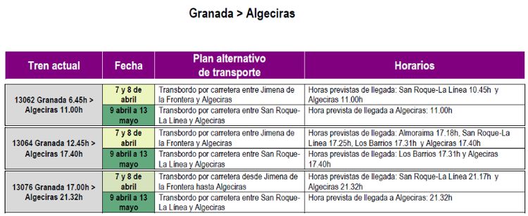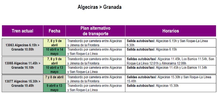 En los trenes de Media Distancia Granada-Algeciras, los transbordos por carretera se realizarán entre Jimena de la Frontera y Algeciras durante el primer fin de semana de abril -en ambos sentidos y también para las paradas intermedias. A partir del 9 de abril y hasta la finalización de los trabajos, prevista para el 14 mayo, los transbordos por carretera se realizarán entre Algeciras y San Roque.