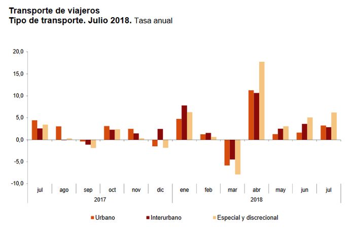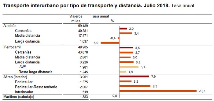 Los datos provisionales publicados por el Instituto Nacional de Estadística revelan que el número de viajeros del transporte público durante el pasado mes de julio se incrementó un 3,4 por ciento respecto al mismo mes del año anterior. En cuanto al número global de usuarios del ferrocarril, creció durante dicho mes un 3,6 por ciento con respecto a la demanda registrada en julio de 2017, porcentaje que se eleva al 5,1 por ciento en el caso de los servicios AVE.