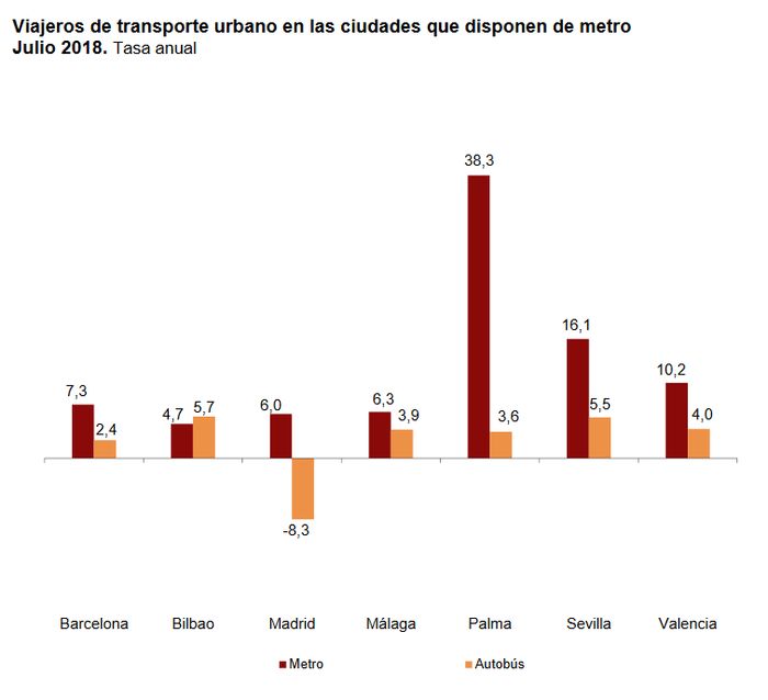 El transporte urbano fue utilizado por más de 234,2 millones de viajeros en julio, lo que supone un 3,3 por ciento más que en el mismo mes del año 2017. En cuanto al transporte metropolitano, registró un total de 96.302.000 viajeros, lo que supone un aumento global de la demanda del 6,7 por ciento, con resultados positivos en las siete ciudades que cuentan con este modo de transporte.