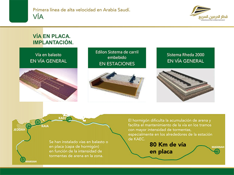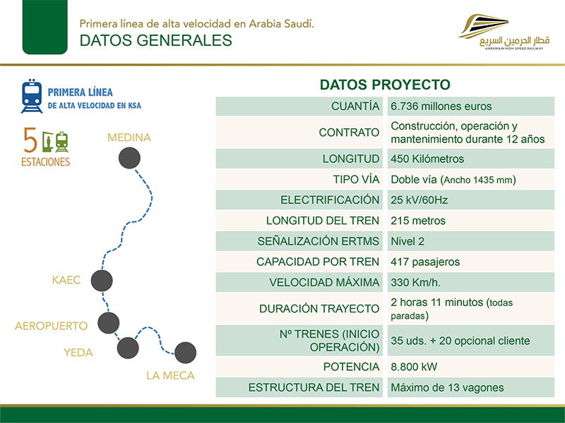 El tren de alta velocidad entre La Meca y Medina, el mayor contrato internacional de un consorcio español, incluye el diseño y construcción de una línea de 450 kilómetros y todos sus sistemas, el suministro de 35 trenes, más un tren real, y la gestión, explotación y mantenimiento de la línea y las estaciones durante doce años.