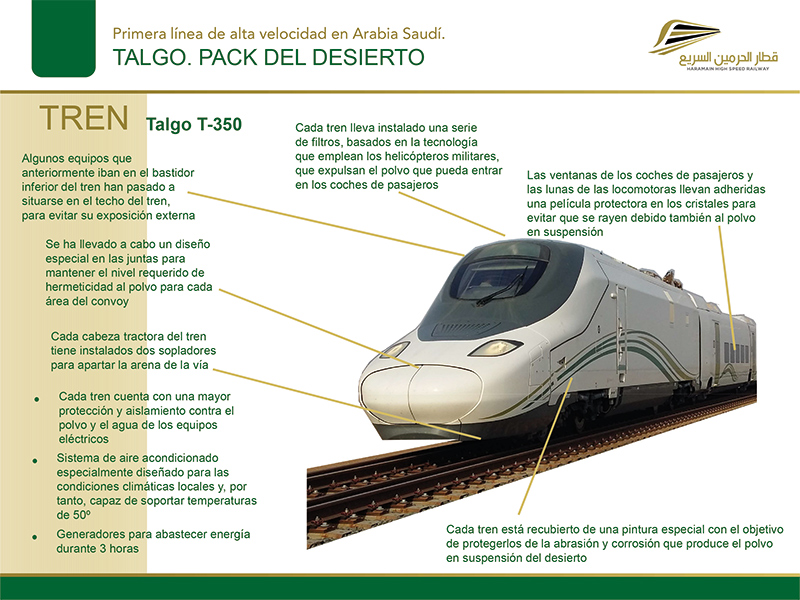 Los 35 trenes Talgo Haramain, serie Talgo 350 SRO, fabricada ya en su totalidad, que ya han recorrido en pruebas 430.000 kilómetros, están adaptados al clima extremo y la geografía de uno de los entornos más hostiles del planeta.