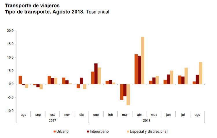 Los datos provisionales publicados por el Instituto Nacional de Estadística revelan que el número de viajeros del transporte público durante el pasado mes de agosto se incrementó un 2,3 por ciento respecto al mismo mes de 2017. En cuanto al número global de usuarios del ferrocarril, creció durante dicho mes en un porcentaje del 5,1 por ciento con respecto a la demanda registrada en agosto del año anterior.