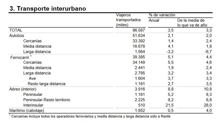 Más de 96,5 millones de viajeros utilizaron el transporte interurbano durante el pasado mes de agosto, lo que supone un incremento del 3,5 por ciento respecto al mismo mes del año anterior. Dentro de éste, el transporte por ferrocarril registró un aumento de la demanda global del 5,1 por ciento en dicho mes.