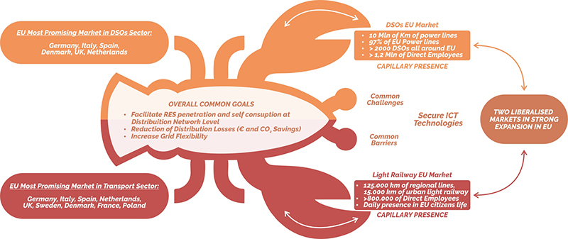 E-Lobster propone un sistema avanzado de gestión llamado R + G (Railway to Grid) que podrá reducir las pérdidas de electricidad en ambas redes, maximizando el uso de fuentes de energía renovables a nivel local y creando una interacción entre ambas mediante una estrategia conjunta.