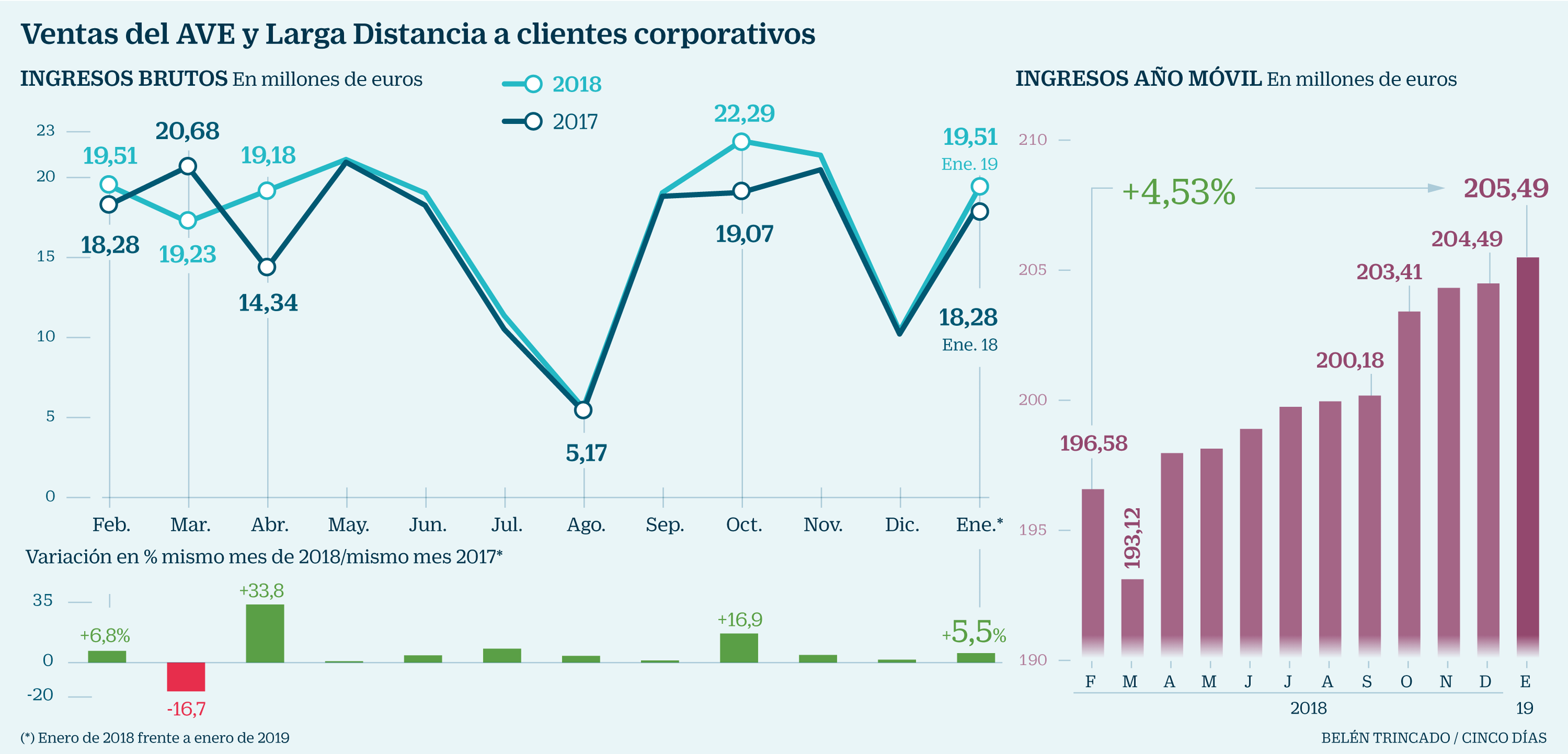 Con la salida de la crisis y la reanimación del tráfico, el negocio por usuarios corporativos ha ido creciendo a una media ligeramente superior al 5% si se comparan mes a mes los dos últimos ejercicios. Según las estimaciones internas más recientes, la larga distancia y alta velocidad de Renfe ha vendido 300.000 billetes en enero y todo a través de un pequeño contact center y de las agencias de viajes.