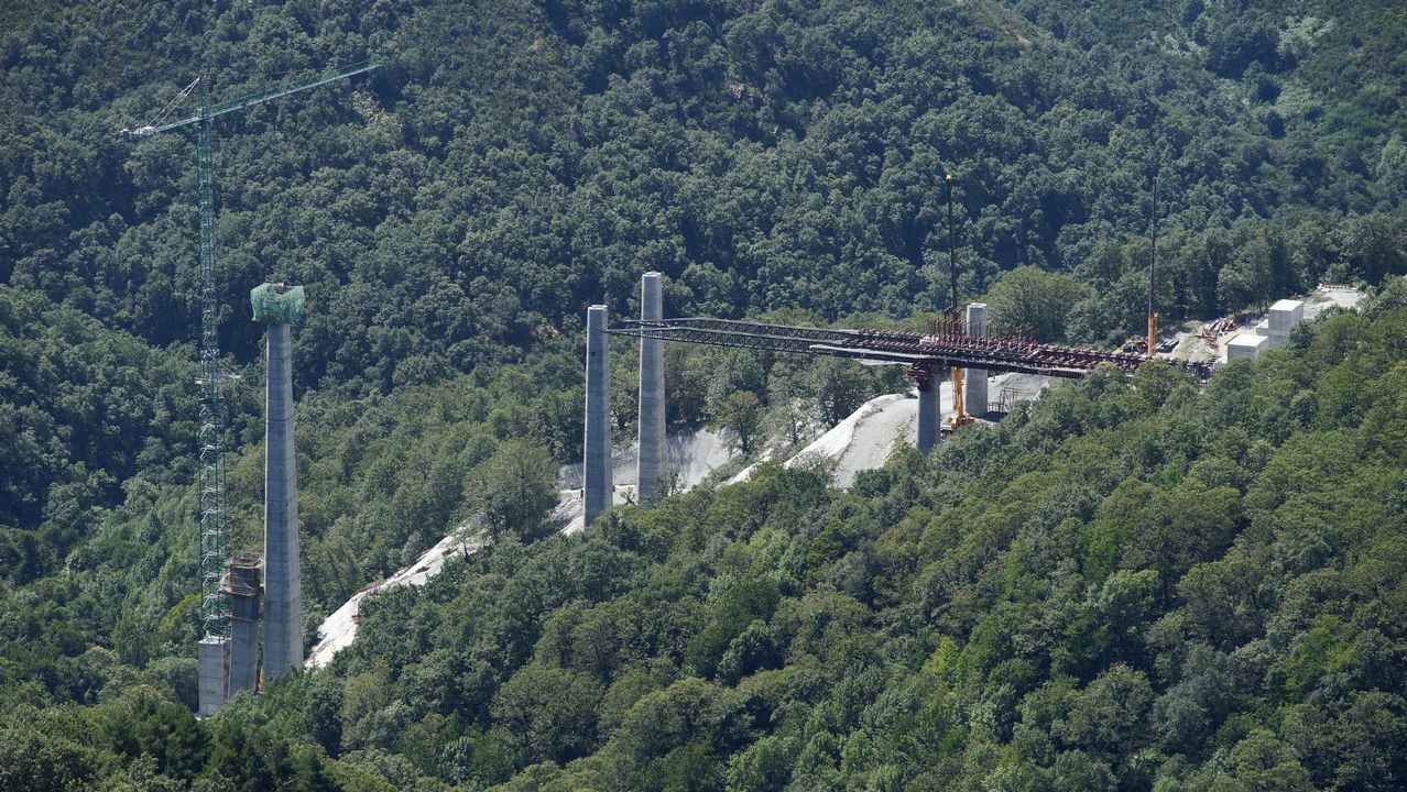 Estuvo casi dos años parado. Las negociaciones con la empresa adjudicataria fueron muy duras, pero al final se consiguió desbloquear el viaducto de Teixeiras, el segundo paso elevado más largo en el tramo del AVE gallego más complejo, el que une Lubián con Taboadela, a las puertas de Ourense. El retraso de esta obra obligó a dividir en dos grandes tramos el despliegue de la vía y habilitar otra base de montaje secundaria, con el objeto de que el retraso en este puente no afectara a la instalación de la superestructura (vía, electrificación, elementos de seguridad...). Las obras se reanudaron a principios del año pasado y a día de hoy los resultados de un ritmo endiablado de trabajo ya son visibles: se ha terminado el tablero de la vía derecha y se ha iniciado el de la izquierda, donde ya se han abatido los semipuntales curvos del arco central que debe salvar el centro del valle, el arroyo de Teixeiras.