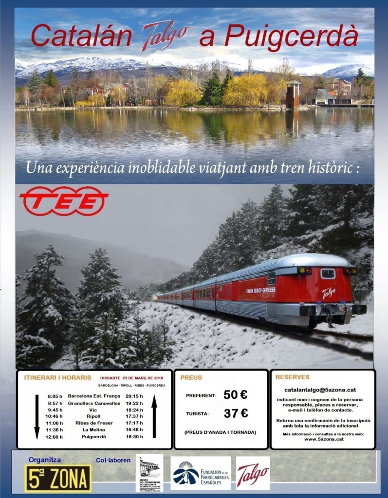 Mañana sábado, se ha programado la circulación del Catalán Talgo que partirá de Barcelona estación de Francia con destino Puigcerdá. Organizado por la Asociación de Amigos del Ferrocarril de Badalona la salida está prevista a las 8,05 horas y el regreso a la ciudad Condal será a las 20,15 horas. + info E-mail