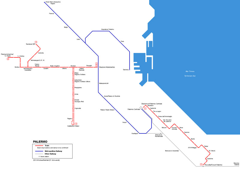 La línea 1 enlazará Roccela con la estación central de Palermo. La línea 2 conectará Piazza Armerina y Notarbartolo; y la línea 3 se bifurcará de la línea 2 en Einstein para llegar hasta la terminal CEP. En la actualidad, se están llevando adelante las pruebas en un tramo de la línea 1 entre Roccela y Ponte dell-Ammiraglio. Se prevé que la línea entre en servicio comercial en 2015.