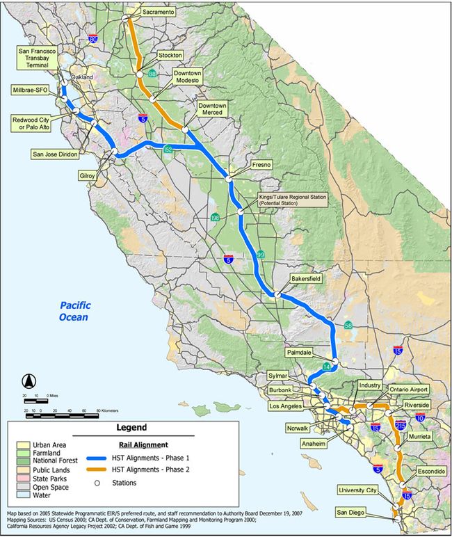La línea de alta velocidad de California conectará San Francisco, Sacramento, Los Ángeles y San Diego con un recorrido total de 1.287 kilómetros y hasta veinticuatro estaciones. En 2029, conectará San Francisco y el área de Los Ángeles en menos de tres horas a velocidades de hasta 400 km/h (Ver noticia).