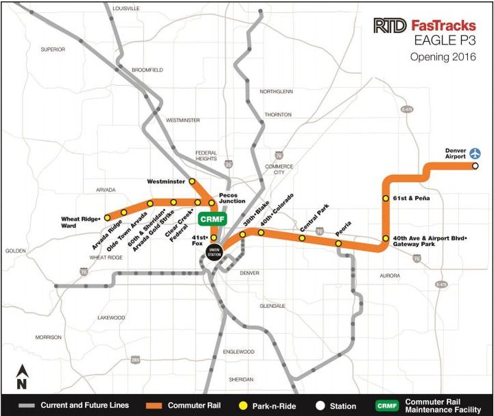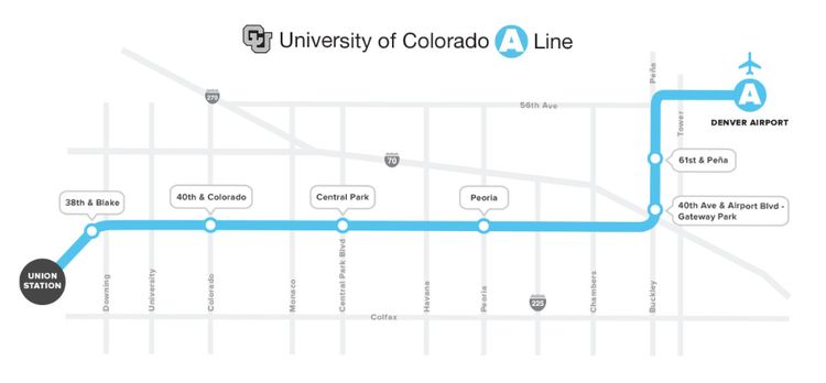 La primera fase del proyecto de colaboración público-privada Eagle para la conexión de cercanías al aeropuerto de Denver entró en servicio el pasado 22 de abril, con la inauguración de la Línea A de la Universidad de Colorado, de 37,8 kilómetros de longitud, que une la estación de Union y la del Aeropuerto Internacional de Denver en 37 minutos.