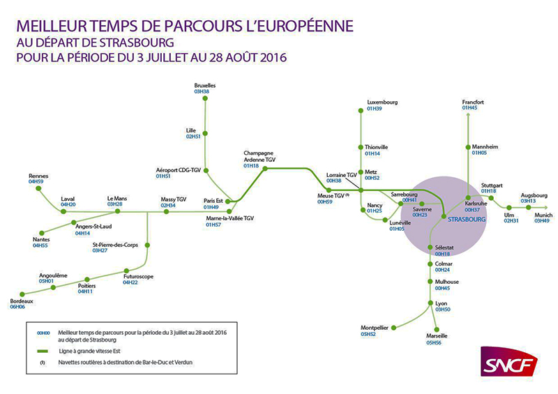Para el lanzamiento de los nuevos servicios, los Ferrocarriles Franceses, SNCF, han puesto a la venta 100.000 billetes a precios reducidos a partir de diez euros. Paris y Estrasburgo quedarán unidas en una hora y 46 minutos en lugar de las dos horas y veinte actuales y las frecuencias previstas permitirán varias opciones para realizar viajes de ida y vuelta en el día e incluso en media jornada.