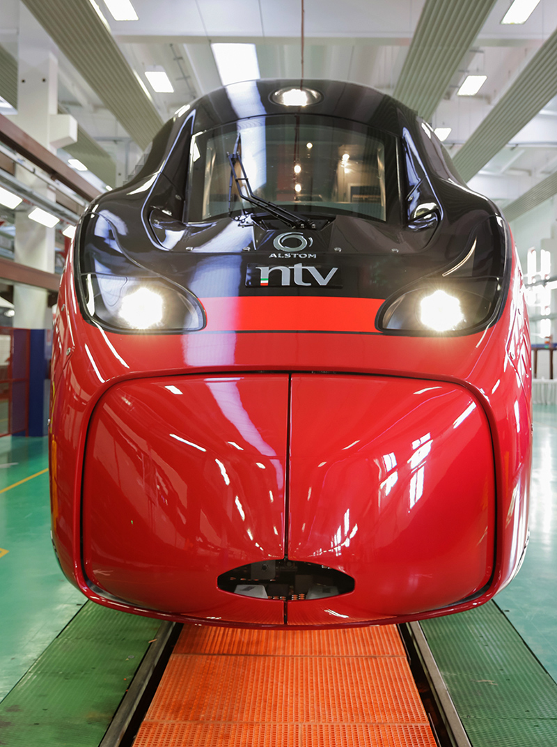 Alstom y NTV han presentado el coche de cabeza del nuevo Pendolino Italo de la operadora de alta velocidad privada italiana, en la factoría de Alstom en la localidad italiana de Savigliano.
