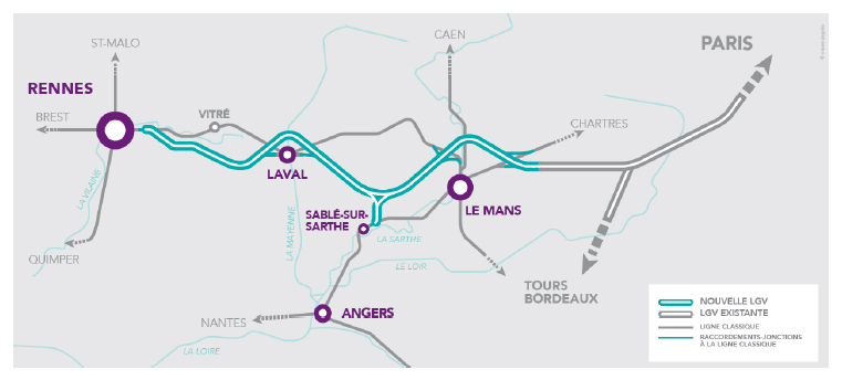 Con 214 kilómetros de línea nueva de los que 182 están construidos con parámetros de alta velocidad, entre Le Mans y Rennes, y 32 corresponden a la conexión con la red convencional, la línea ha exigido una inversión de 3.400 millones de euros.