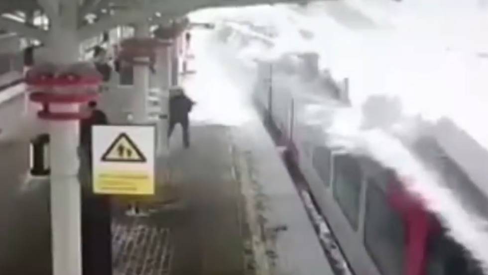 La conocida como nevada del siglo en Moscú provocó que cayeran 43 centímetros de nieve en 24 horas, más de la mitad de lo que se suele acumular en un mes, según el Servicio Nacional de Meteorología ruso. Las imágenes de una cámara de seguridad instalada en la estación de tren de Kóptevo, en el norte de la capital, revelan una de las inesperadas consecuencias de este temporal. La masa de nieve acumulada en el techo cayó de forma repentina sobre un tren que pasaba en ese momento, además de cubrir parte del andén con un manto blanco. A pesar del pequeño alud, nadie resultó herido y tampoco se registraron daños materiales, según medios locales. La intensa nevada ha provocado también desafortunadamente la muerte de una persona y se han registrado varios heridos por la caída de 2.000 árboles, cancelaciones de vuelos y problemas en el tráfico.