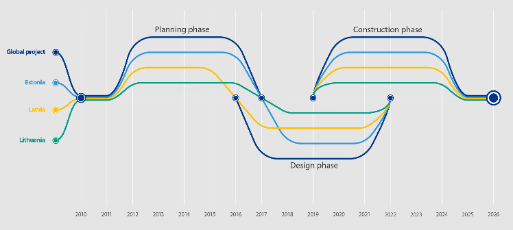 El trazado de la línea que unirá las tres repúblicas del Báltico será de 870 kilómetros de los cuales, 213 transcurren por Estonia, 265 en Letonia y 392 en territorio lituano. Tras la planificación del trazado se afrontarán el diseño técnico preliminar y el diseño técnico detallado de la infraestructura de Rail Báltica en los tres países.