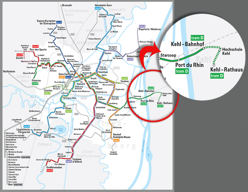 La extensión de la línea D del tranvía transfronterizo entre Estrasburgo y Kehl, permite a los pasajeros finalizar su viaje en el centro de la ciudad alemana y acceder a las conexiones con la red de autobuses de Kehl dentro del nuevo intercambiador situado en la Plaza del Ayuntamiento.