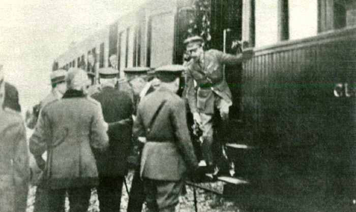 Alfonso XIII, Rey de España; desciende del tren que inauguró el ferrocarril vasco del Urola. Se dice que este Rey realizó más de setecientos viajes en tren.