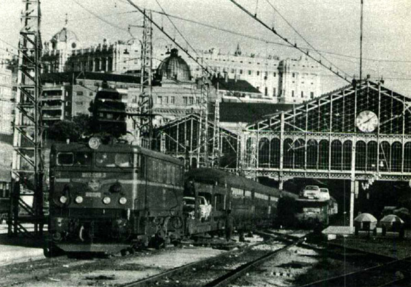 Salida del expreso Rías Altas (Madrid-La Coruña), desde la estación de Príncipe Pío, con la locomotora 269-068 en cabeza