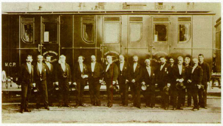 Personalidades ferroviarias españolaa y portuguesas posan ante el primer coche-cama de la CP que prestó servicio entre Lisboa y Madrid en 1855.