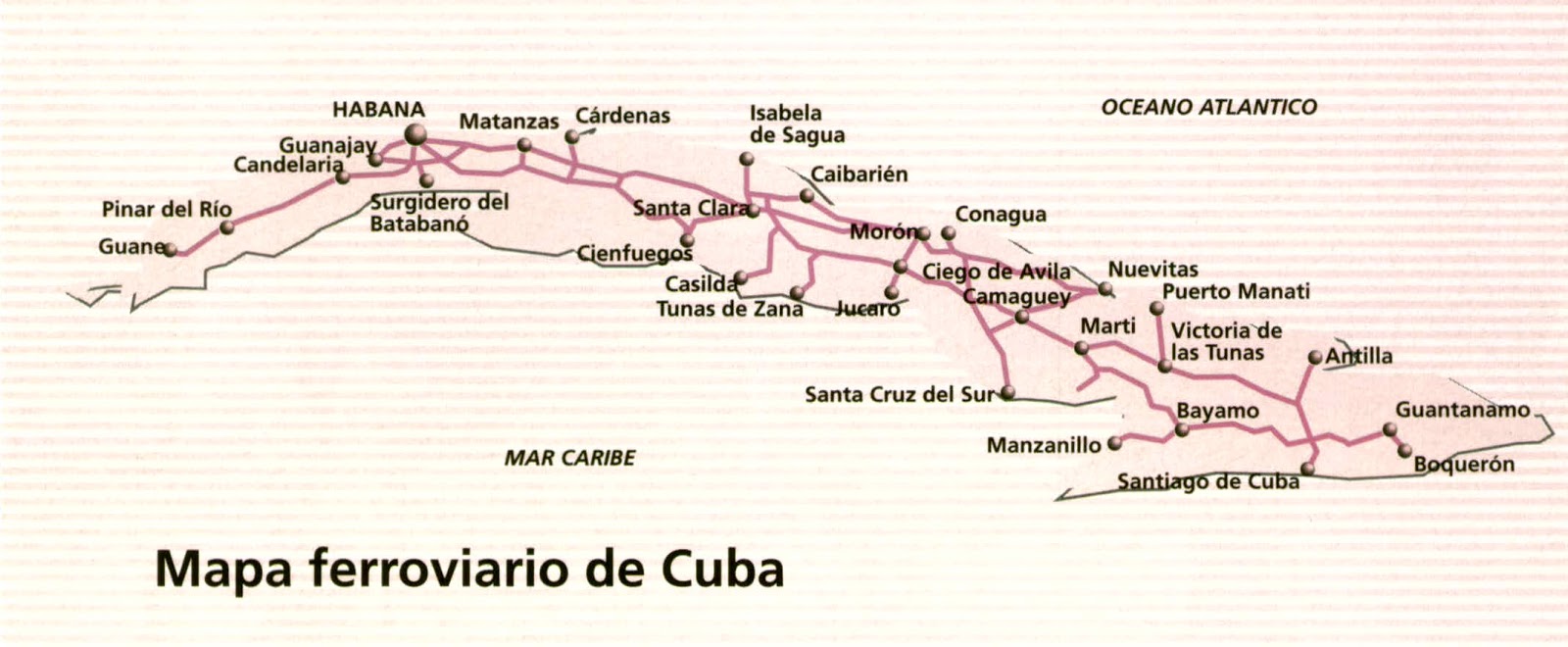 En la actualidad, la red ferroviaria de Cuba ofrece una red de 4.226 kilómetros de vías que, en su práctica totalidad se explotan con tracción diesel. La dependencia tecnológica norteamericana fue sustituida tras la revolución de 1959, por la soviética y, en los últimos años también han sido frecuentes las adquisiciones de nuevas locomotoras en China y de trenes de ocasión en Canadá y países europeos como España o Francia. Por ejemplo, la única línea electrificada de la isla entre La Habana y Matanzas cuenta con veteranos trenes de cercanías procedentes de Barcelona y el tren más lujoso que enlaza la capital con Santiago, es oficialmente denominado Tren Francés debido a que su composición está formada por coches de acero inoxidable de los antiguos Trans Europ Express que enlazaban París con Bruselas, comprados en Francia a la SNCF.