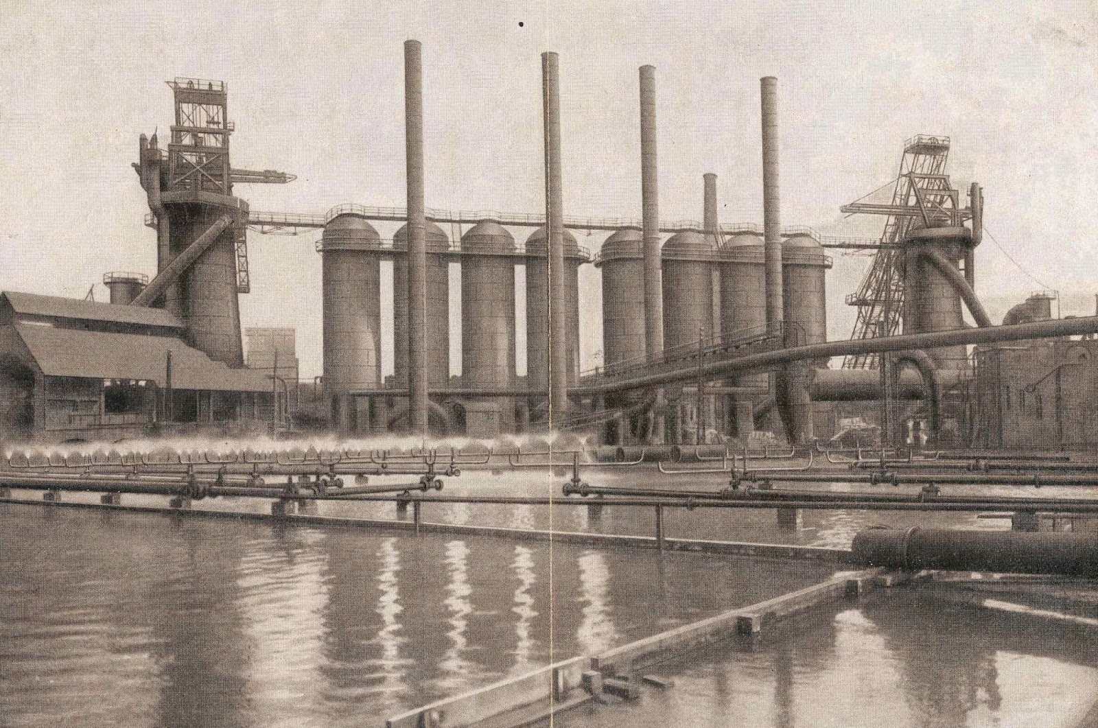 Vista de los dos altos hornos y sus respectivas estufas, de la Compañía Siderúrgica del Mediterráneo. Archivo EuskoTren/Museo Vasco del Ferrocarril