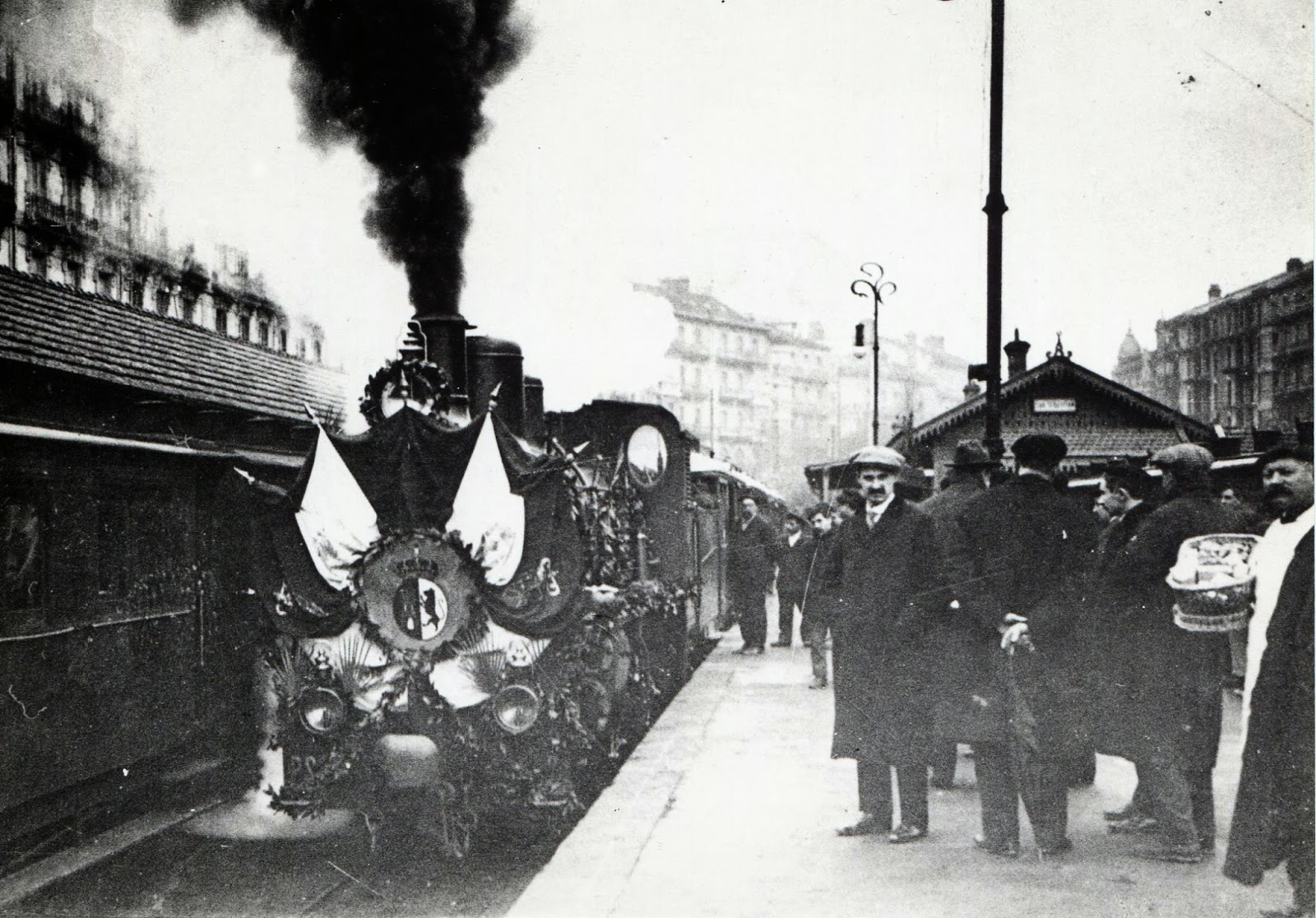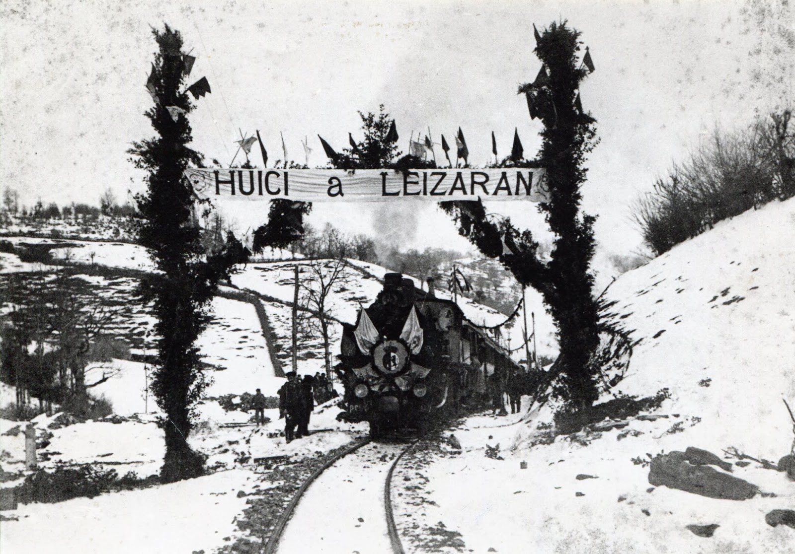 El tren inaugural, a su llegada a Huici, donde se levantó un arco triunfal. Archivo EuskoTren/Museo Vasco del Ferrocarril
