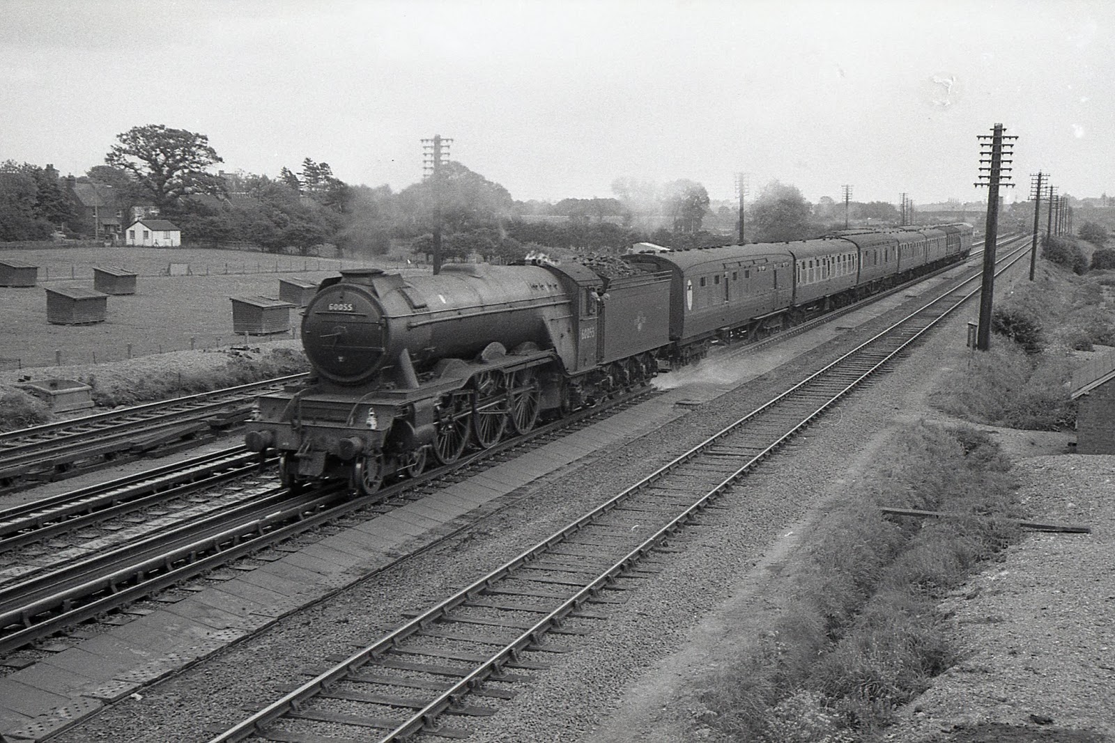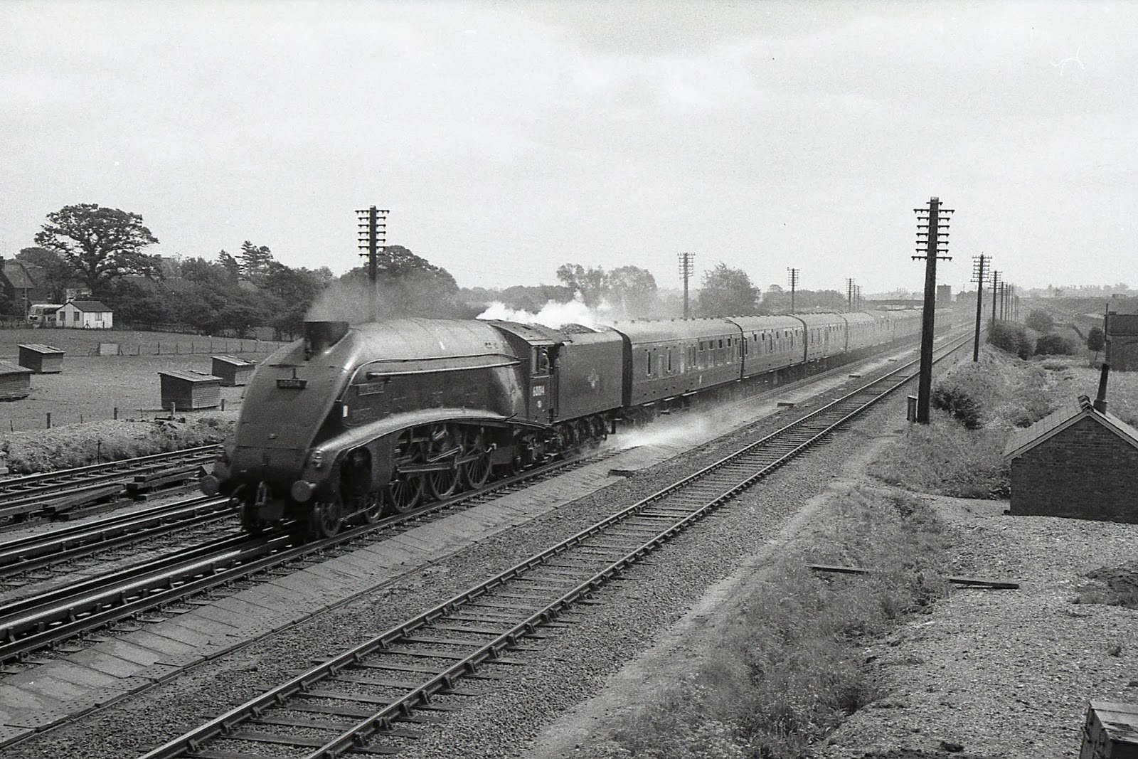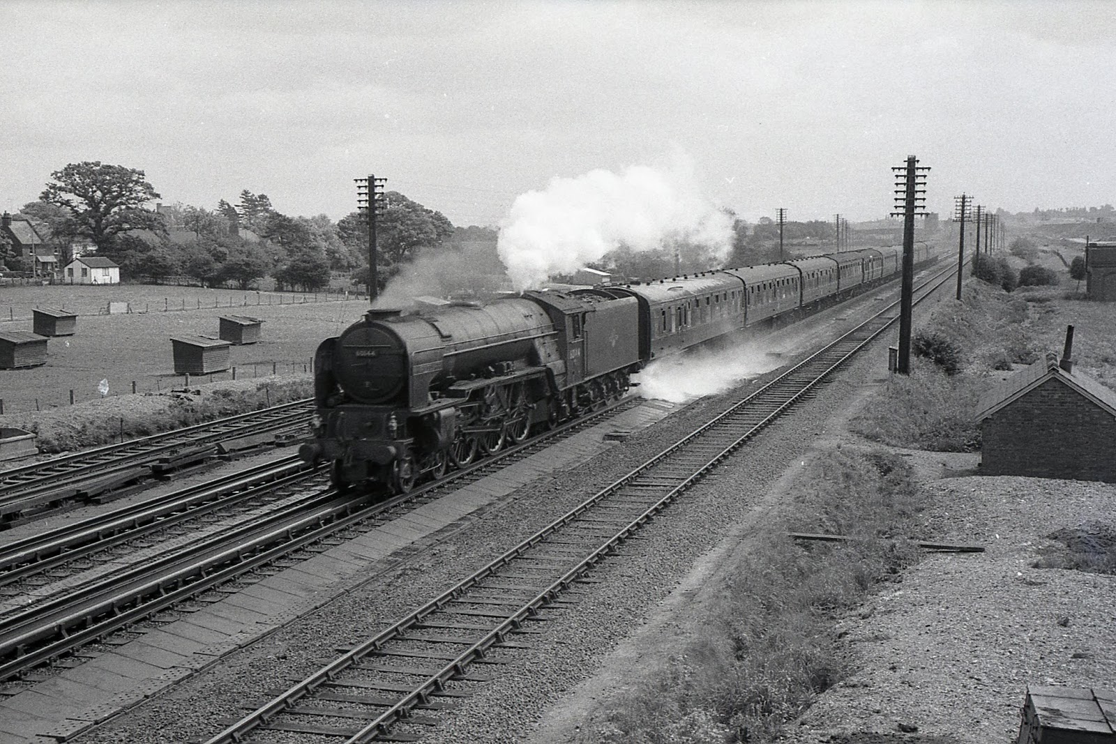 Un tren, encabezado por una Pacific del tipo A-1, toma agua a toda velocidad. Fotografía de Trevor Rowe