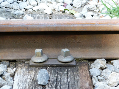 Carril suministrado por la Société Metallurgique de Sambre et Moselle al Ferrocarril del Urola. la playa de vías del Museo Vasco del Ferrocarril está conformada, en su mayoría, por estos históricos carriles