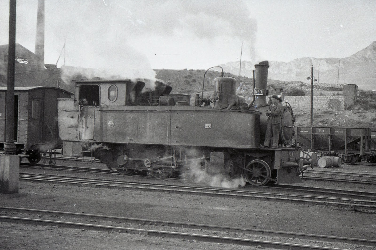 La locomotora de vía métrica Nº 7, maniobra en Río Martín. 8 de abril de 1961. Fotografía de Trevor Rowe, archivo EuskoTren/Museo Vasco del Ferrocarril