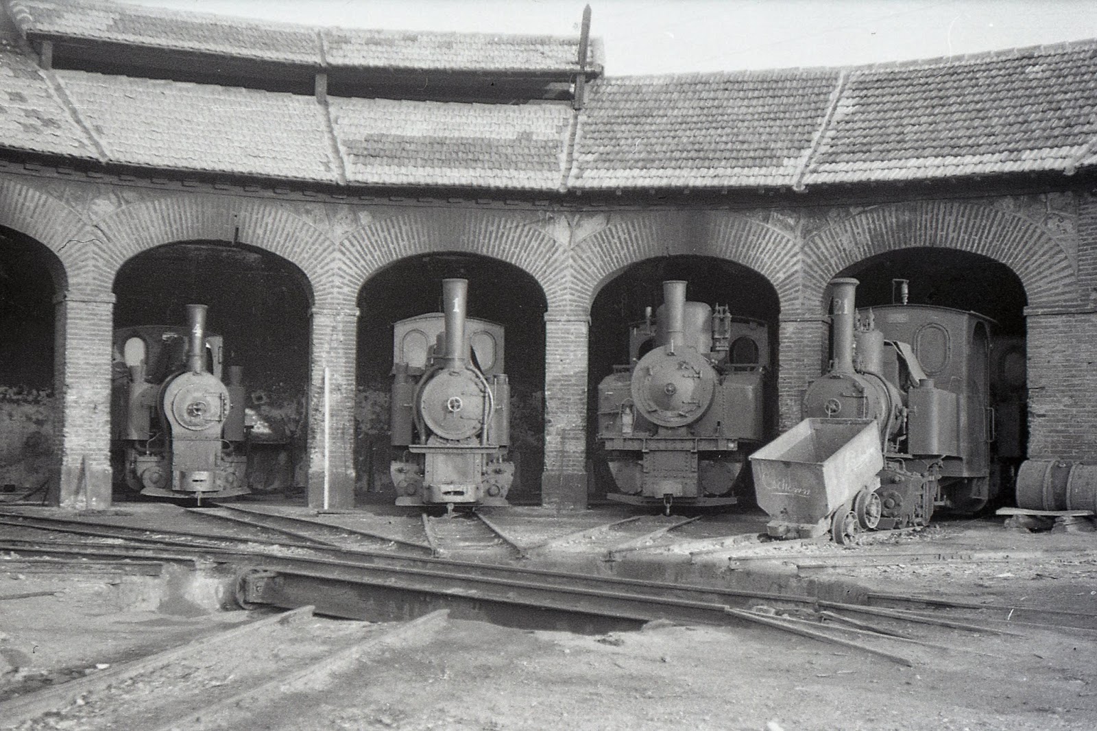 Vista de la rotonda de vía estrecha de Utrillas. Entre las locomotoras se encuentra la Nº 1 «Hulla», ahora en activo a la cabeza del tren turístico de esta localidad turolense. 8 de abril de 1961. Fotografía de Trevor Rowe, archivo EuskoTren/Museo Vasco del Ferrocarril