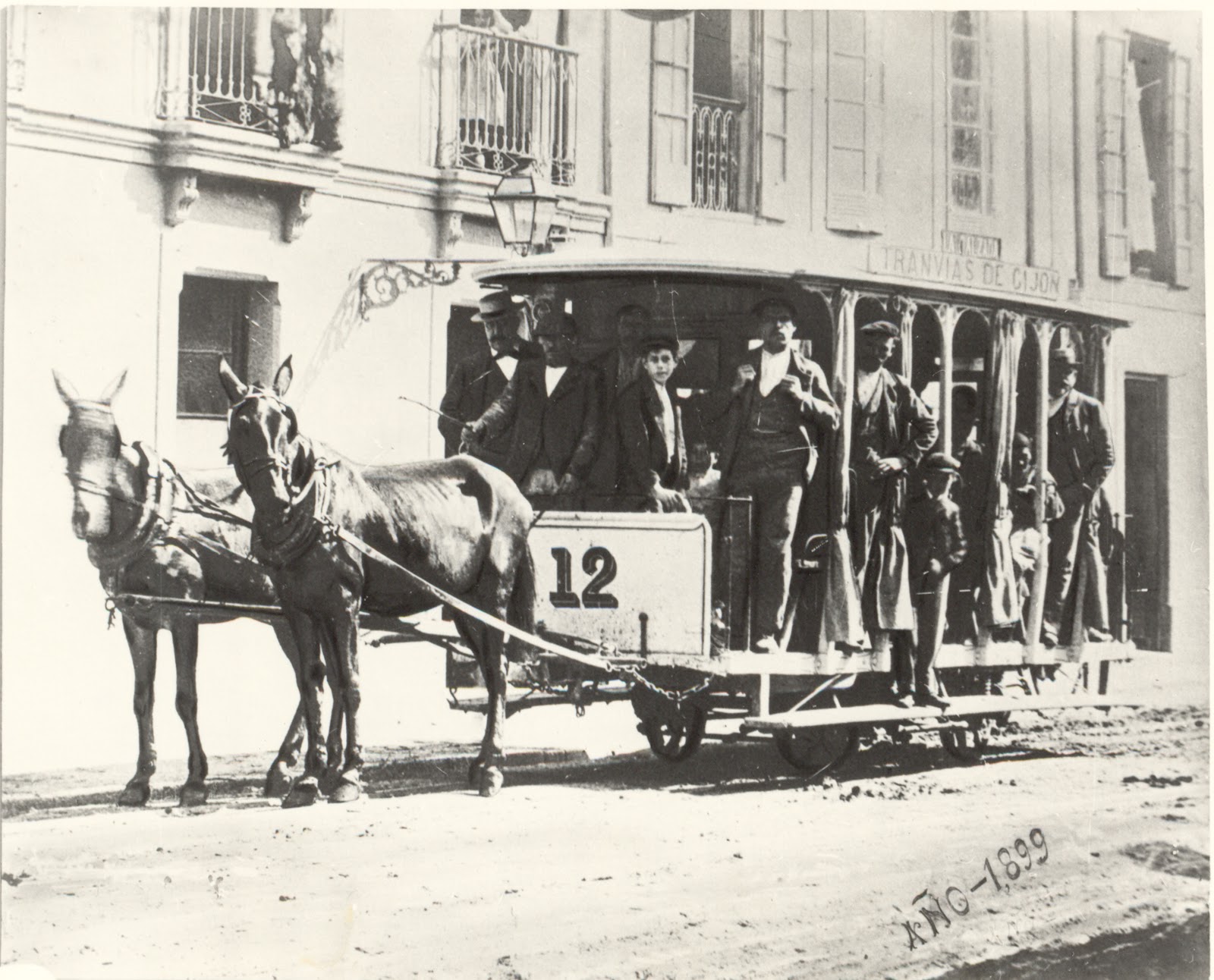 Tranvía de motor de sangre de Gijón. A los mandos, el mayoral. Archivo del Museo del Ferrocarril de Asturias