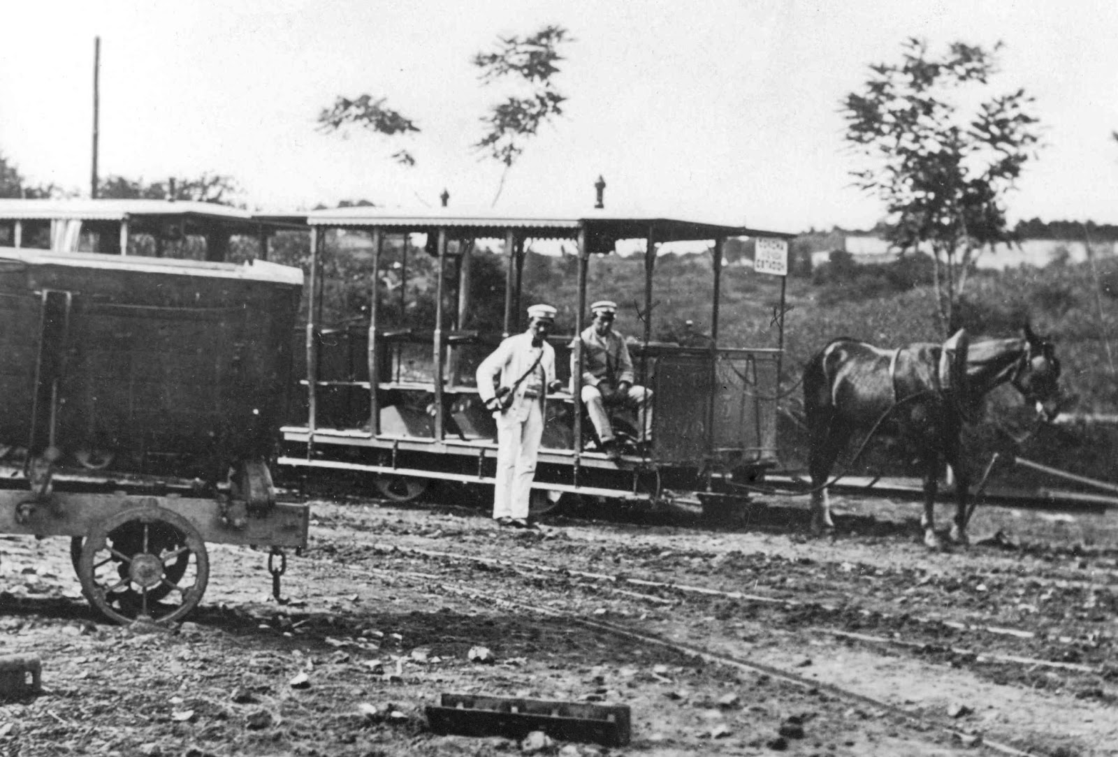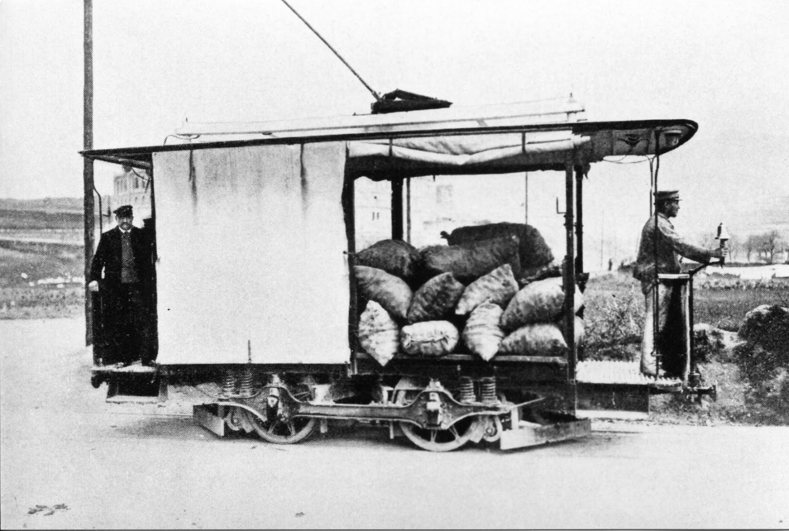 Tranvía de mercancías de Bilbao fotografiado en 1896. En la plataforma de la derecha se aprecia la presencia del Wattman, manejando el tranvía, mientras que en la de la izquierda se ve al conductor, es decir, el responsable de supervisar el servicio. Archivo de Georges Muller