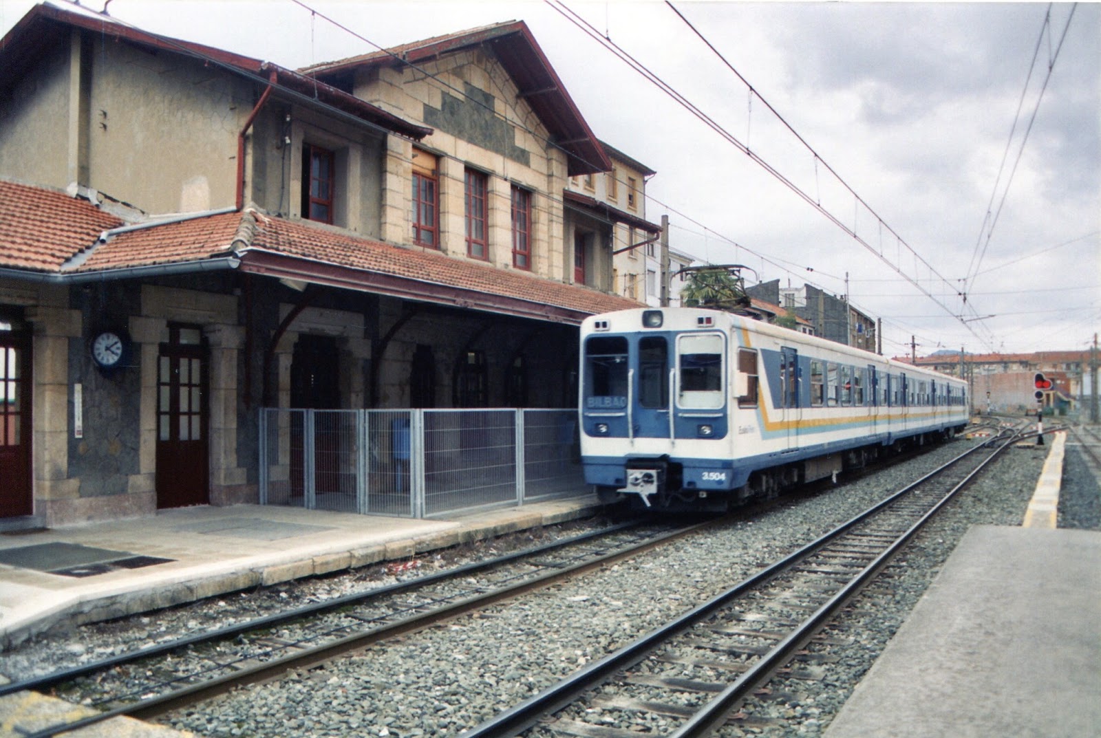 Unidad 3500 tras la reforma de los años noventa, con una nueva librea blanca con franjas azules y amarillas. Estación de Gernika