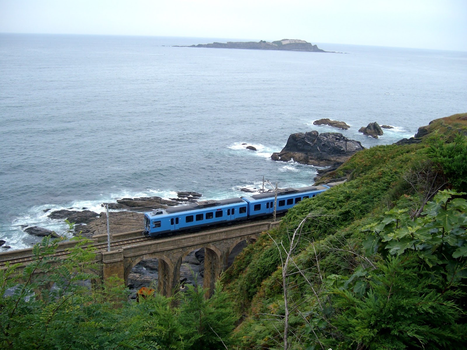 Unidad 3500 a su paso sobre el viaducto de Lamiaran. Al fondo se observa la isla de Izaro