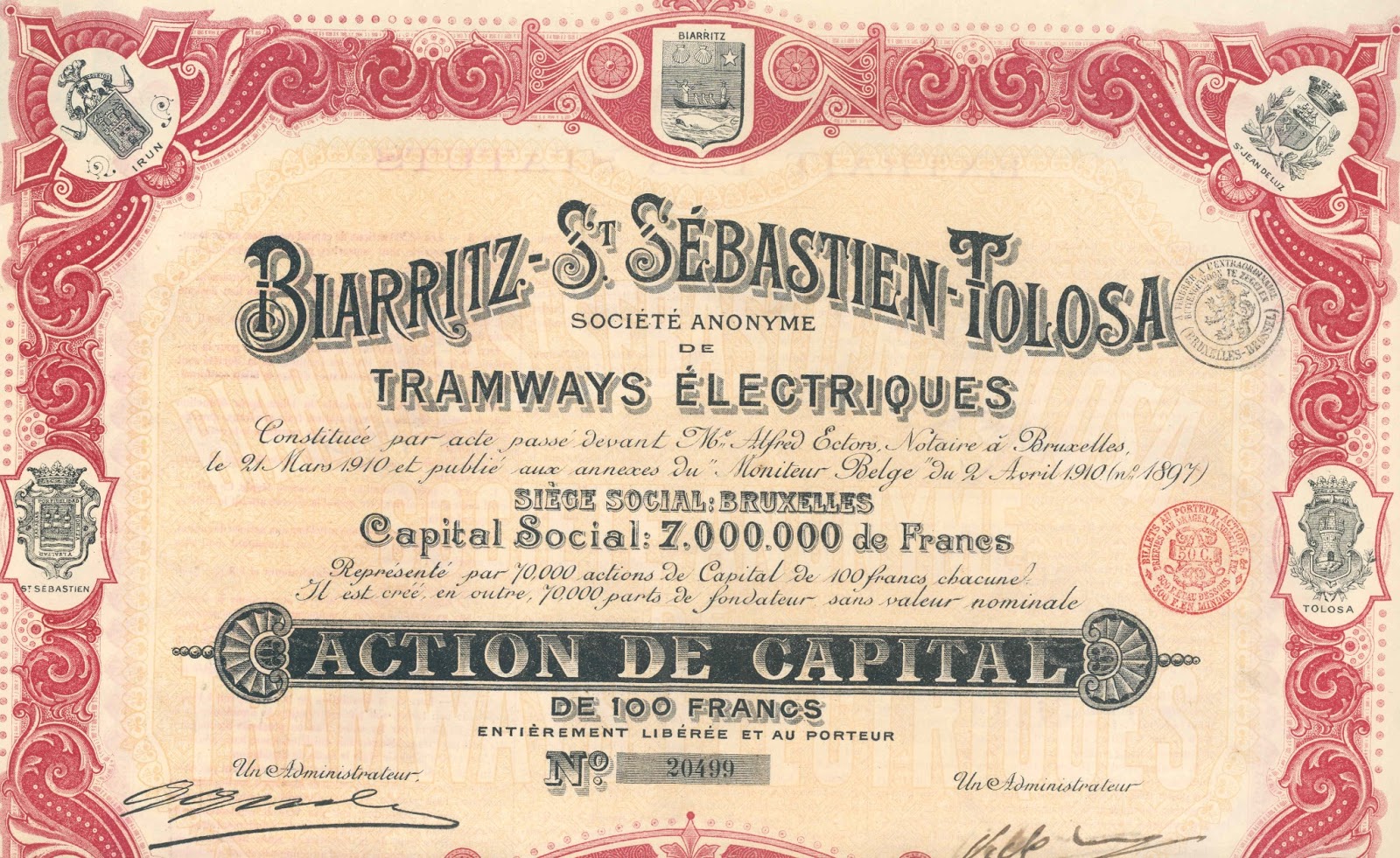 Acción de capital de la compañía del tranvía de Biarritz a San Sebastián y Tolosa