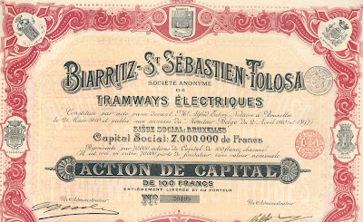 Una de las historias tranviarias más rocambolescas de nuestro país (y, también, del vecino) fue el del proyecto de tranvía internacional de Biarritz a San Sebastián y Tolosa. Los orígenes de esta curiosa iniciativa se remontan al 21 de marzo de 1910, fecha en la que se constituyó en Bruselas la Société Anonyme de Tramways Electriques Biarritz-St. Sébastién-Tolosa. En teoría, la nueva empresa abrigaba el propósito de construir una línea internacional de tranvías eléctricos con la que pretendía enlazar las poblaciones que figuraban en su razón social. El capital previsto era de siete millones de francos belgas repartidos entre 70.000 acciones a 100 francos. Asimismo, contaba con otras 70.000 partes de fundador sin valor nominal.