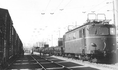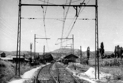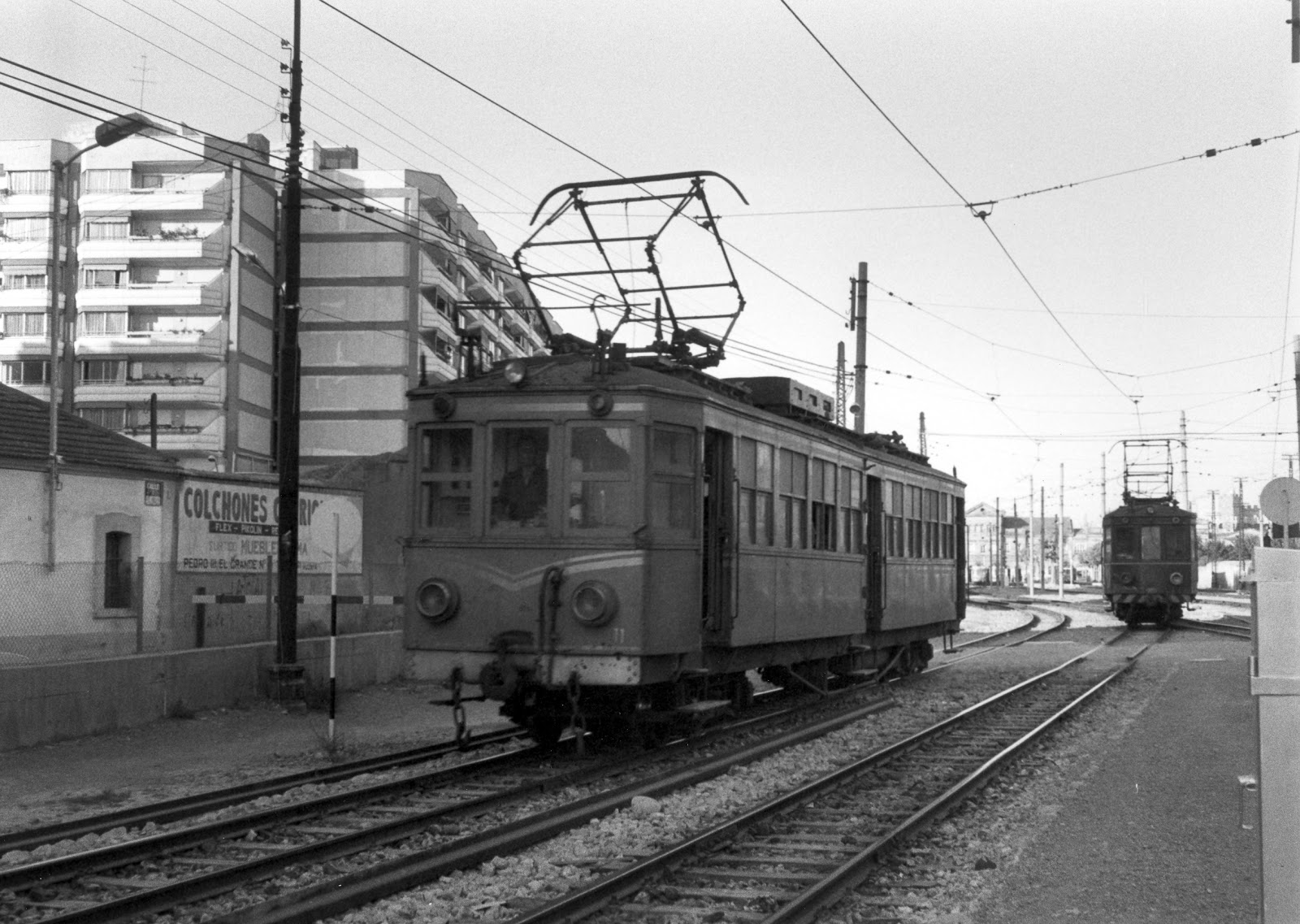 Imagen del "trenet" de Valencia. Se aprecia que algunos tramos, como la playa de vías de la estación de Valencia-Pont de Fusta, estaba nelectrificados con línea aérea simple