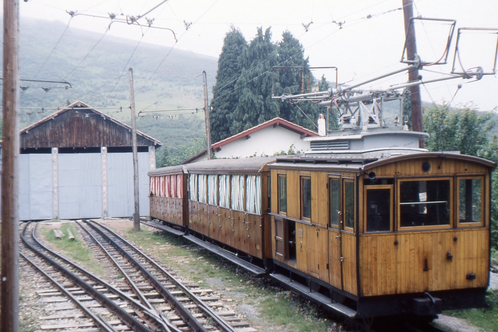 Locomotora del ferrocarril de cremallera de La Rhune, electrificado en corriente alterna trifásica. Se aprecian los pantógrafos dobles