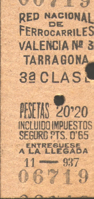 Billete de la Red Nacional de Ferrocarriles republicana, del año 1937, para el trayecto de Valencia a Tarragona, en la antigua red de la Compañía del Norte. Documento cedido por Javier Fernández López