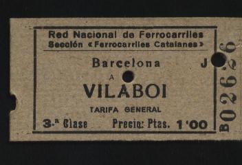 Billete de la Red Nacional de Ferrocarriles, utilizado en este caso, en una línea de vía estrecha, en concreto, entre Barcelona y la actual Sant Boi. Documento cedido por Javier Fernández López