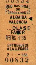 Billete de la Red Nacional de Ferrocarriles republicana, impreso en 1938, para el trayecto de Albaida a Valencia, sobre la antigua red de la Compañía del Norte. Documento cedido por Javier Fernández López