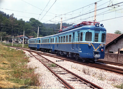 Automotor Naval con remolques del Vasco-Navarro, fotografiado en la bilbaína estación de Achuri por Javier Aranguren Castro
