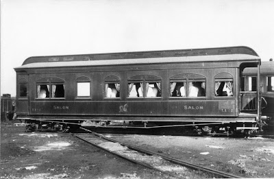 Fotografía de fábrica de un coche Pullman de los Ferrocarriles Vascongados, ahora utilizado como salón en el Transcantábrico