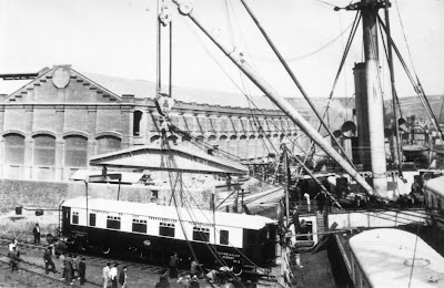 Descarga de los coches Pullman de los Ferrocarriles Vascongados en los muelles de Zorroza