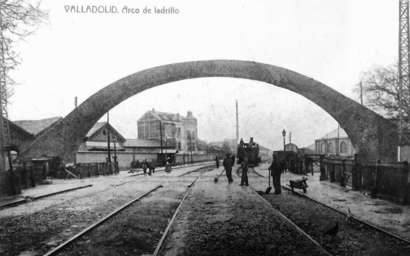El arco de ladrillo de Valladolid recuerda que en esta ciudad se iniciaron las obras del ferrocarril del Norte. Archivo EuskoTren/Museo Vasco del Ferrocarril