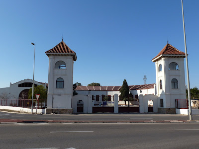Espectaculares cocheras de la red de trolebuses de La Plana. Tras las dos torres, se encuentra el edificio, similar al de una rotonda de locomotoras de vapor, en el que los trolebuses entraban por un extremo y salían por el opuesto