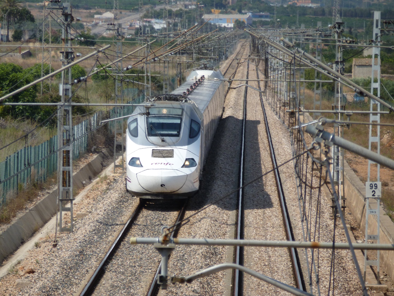 En la mayor parte de las líneas de Adif se circula por la derecha. Vista de un tren de la serie 120 de Renfe en el corredor Mediterráneo