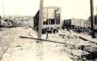 Detalle de los daños sufridos por el material móvil en el bombardeo. Al fondo se observa el edificio de los talleres de material móvil del ferrocarril, cuya cubierta resultó muy dañada. Fotografía de Rino Zitelli, cedida por Franco Borgato